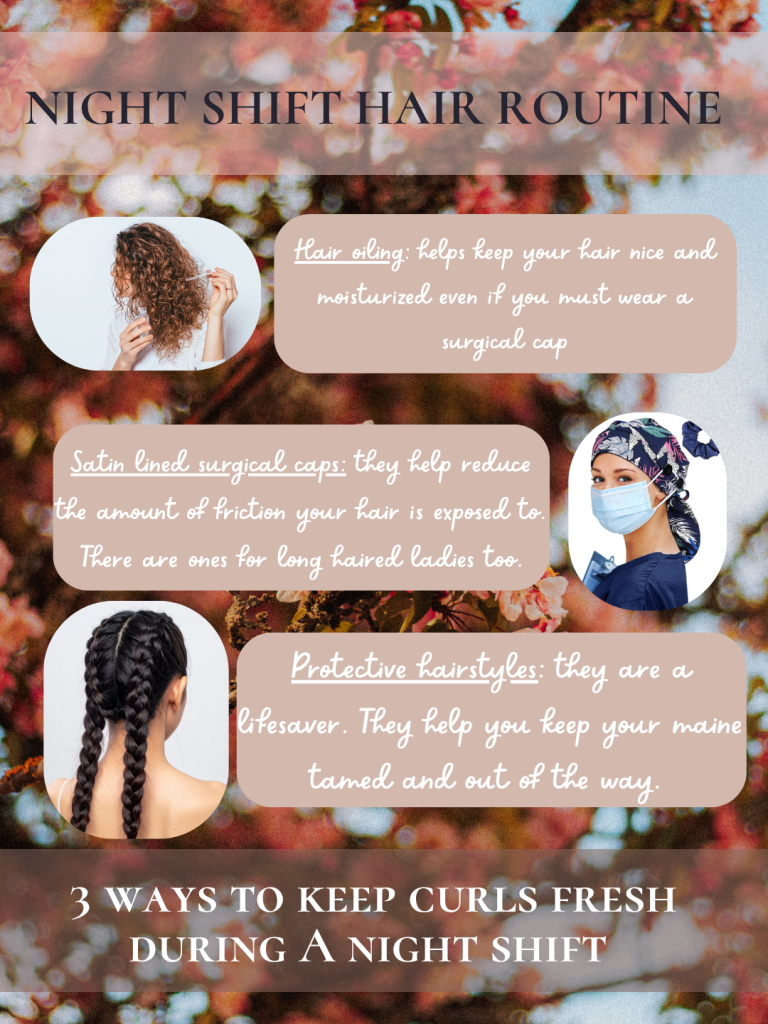 - Hair oiling: I carry a small bottle of hair oil to keek my curls from getting too dry or too tangled as they rub against my scrubs all day. I apply the oil at the ends and at the nape of my neck where my hair gets most tangled. One suggestion is: garnier’s frizz control serum